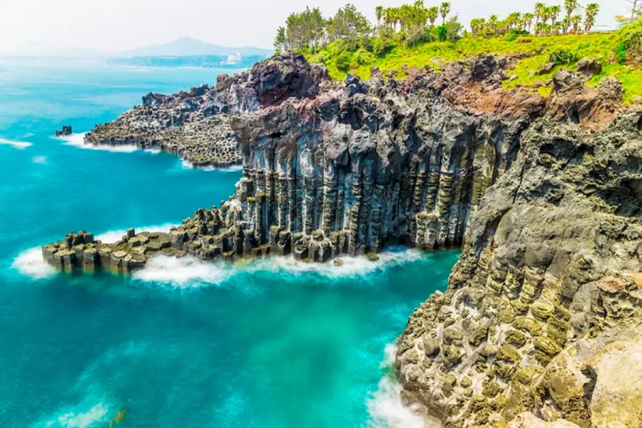 - Cột đá Jusangjeolli có nghĩa là Ghềnh đá đĩa - đá ở đây được hình thành từ dung nham chảy từ miệng núi lửa Hallasan từ vài trăm năm trước. Bãi cột đá được cấu tạo bởi vô số các phiến đá hình lục giác xếp liền kề với nhau, một cách tình cờ nhưng lại tổng thể lại vô cùng thú vị.
